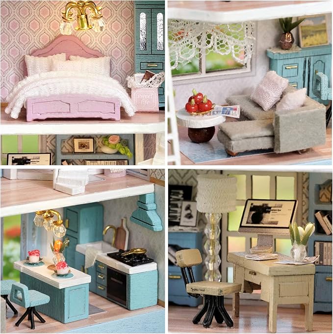 Chaque élément de La Maison Bleue a été conçu avec précision : meubles miniatures, tissus délicats, accessoires décoratifs et textures authentiques. Les matériaux — bois, tissu, plastique et papier — sont de haute qualité et sûrs. Une fois assemblée, cette maison dégage une atmosphère paisible et devient une décoration à part entière.